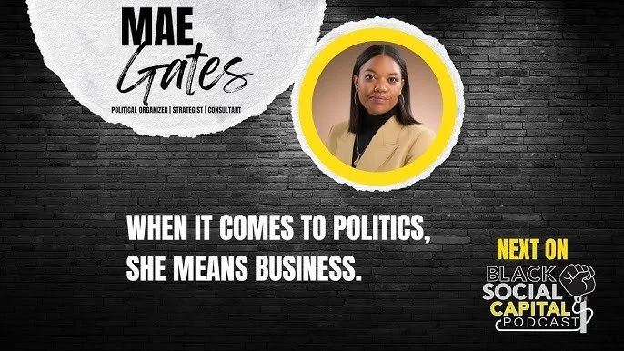 black brick with image in yellow circle, mae gates feature on black social capital podcast